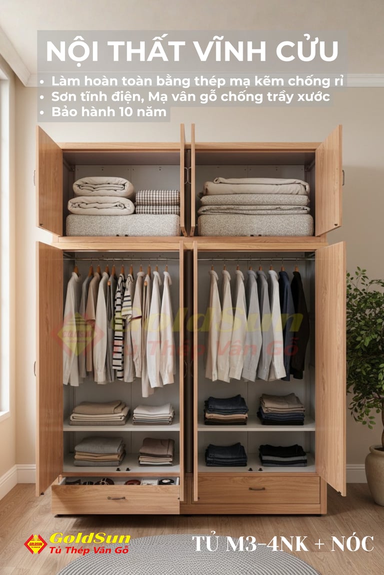 Điểm cộng lớn của mã tủ M3-4NK là hệ thống ngăn kéo dưới cùng. Đây là "vương quốc" riêng cho đồ lót, tất vớ, thắt lưng hay các phụ kiện nhỏ dễ thất lạc, giúp bạn dễ dàng tìm kiếm khi cần.