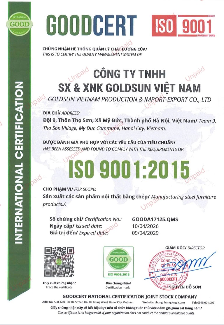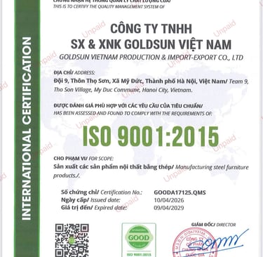 Chất lượng đạt chuẩn quốc tế: Yếu tố làm nên tên tuổi của GoldSun chính là sự cam kết tuyệt đối về chất lượng. Toàn bộ quy trình sản xuất và quản lý chất lượng của công ty đều đạt chứng chỉ tiêu chuẩn quốc tế ISO 9001:2015. Điều này đồng nghĩa với việc mỗi chiếc tủ thép vân gỗ khi đến tay khách hàng đều đã trải qua các khâu kiểm định nghiêm ngặt nhất, đảm bảo độ bền bỉ và tính an toàn cao nhất.